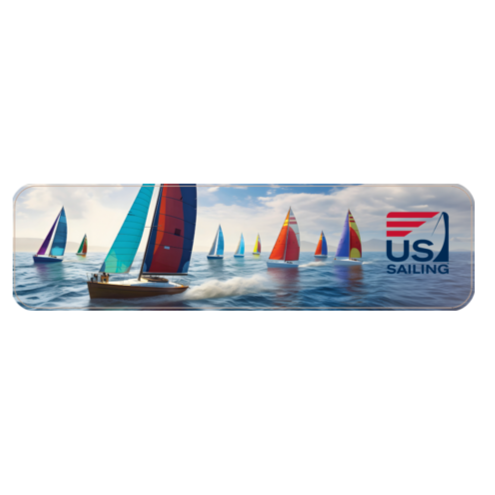 Paper bookmark with US Sailing logo and image of colorful sailboats on the water